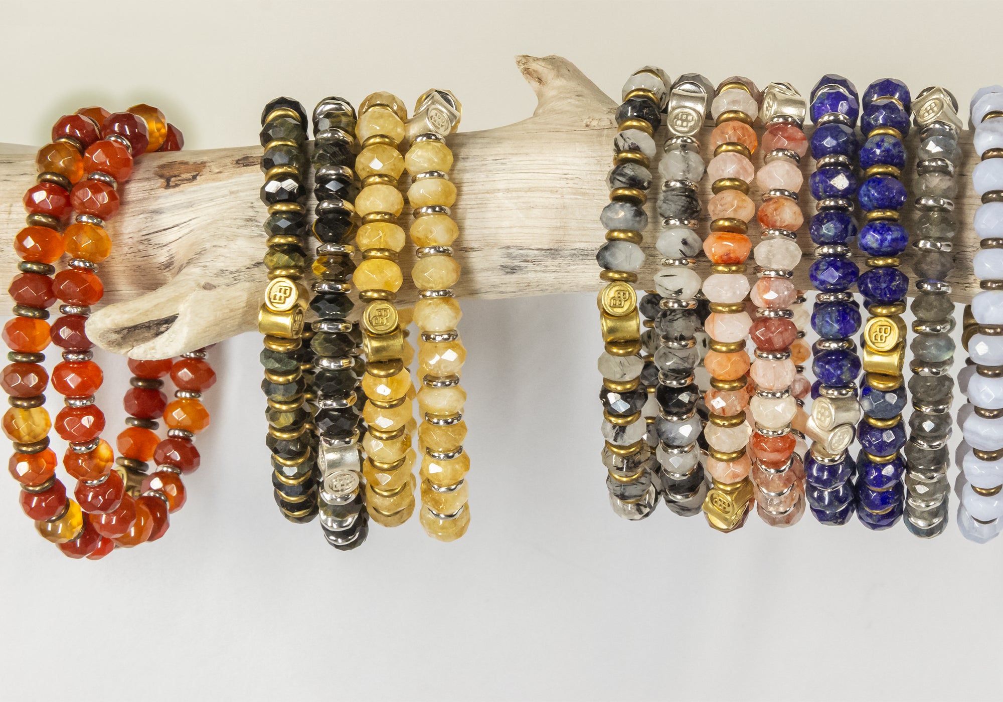 Courageous Carnelian, Soothing Blue Tigers Eye, Prosperity Creating Citrine, Protective & Grounding Tourmalinated Quartz, Focus Enhancing Red Hematoid Quartz, Communicative Lapis Lazuli, Intuitive Labradorite, and Stabilizing & Calming Blue Lace Agate.