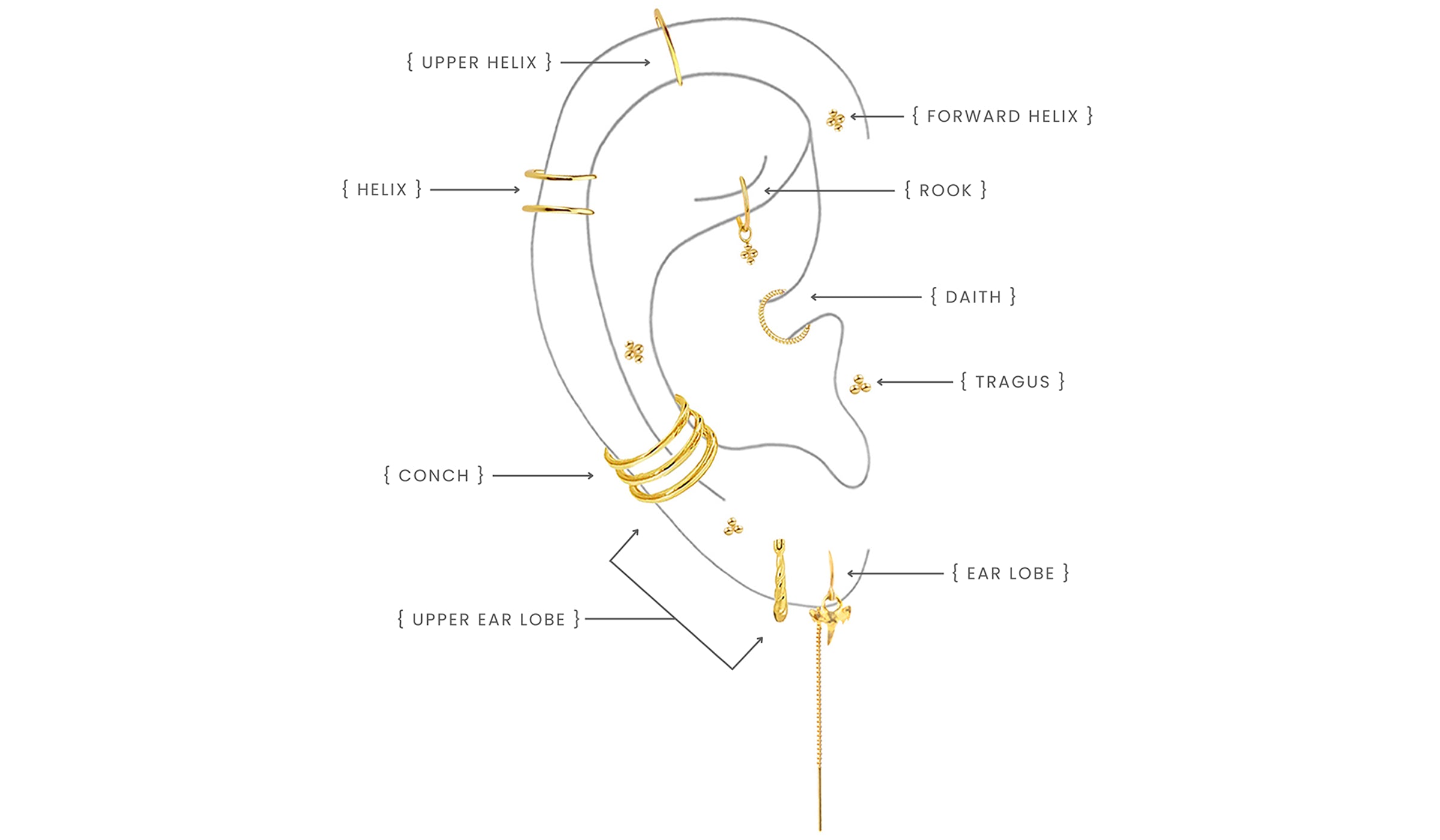 UPPER EAR LOBE - additional standard ear lobe piercings can be placed on the upper ear lobe. These piercings lead up towards the conch.