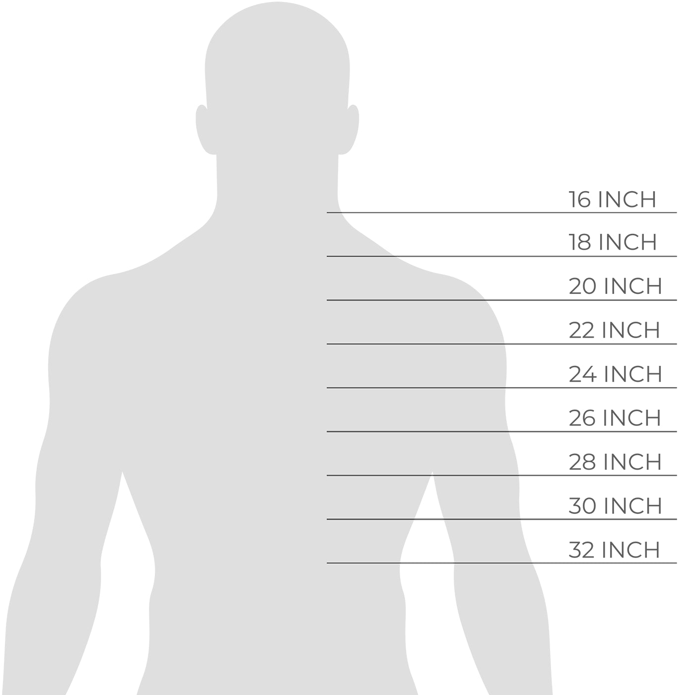 Illustration indicates the approximate location where the necklace drapes over a man's neckline, collarbone and chest. Utilize as reference only. This visual aid helps show where the necklace's length will sit on a mans body. Measurements may vary based on individual body characteristics.