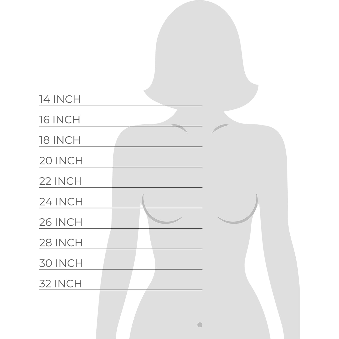 The chart indicates where the necklace length hits on a woman's neck, bust and body. Please be aware that this is an overview and not exact, as each individual has a unique body shape, size and neck width and length. Use this as a guide for the approximate location of where the necklace will fall.